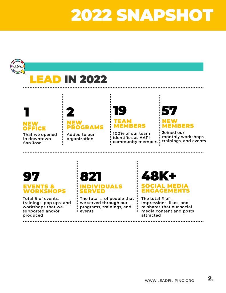 We are proud to present our 2022 LEAD Filipino Annual Report, which we informally call our “Look Back At It” storybook. To everyone that continues to support and contribute to our mission and vision, thank you. Thank you for believing in our potential and vision. Thank you for selflessly and wholly giving your resources and time to the community. We truly could not do this life-changing work without you.