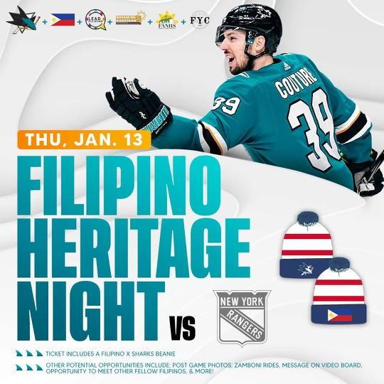Join us for the San Jose Sharks’ FilAm Heritage Night on Thursday, January 13th at 7PM vs. the New York Rangers! We’ll be right at the front entrance with the special giveaways and info about our org of course!