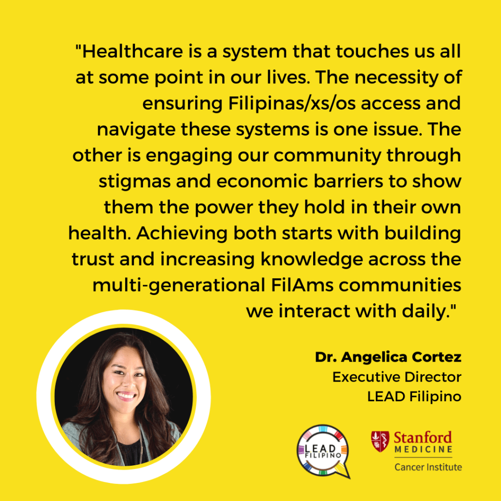 “Healthcare is a system that touches us all at some point in our lives. The necessity of ensuring our FilAm community accesses and navigates these systems to receive prevention (and intervention) services is one issue. The other is engaging them to understand the power they hold with their own health. Building this confidence means providing information on the various health services and resources available, educating around diet and lifestyle, and emphasizing regular medical screenings,” said Dr. Angelica Cortez, founder and executive director of L.E.A.D Filipino.