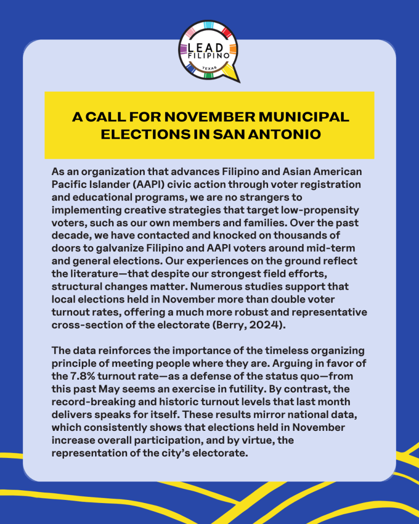 As an organization that advances Filipino and Asian American Pacific Islander (AAPI) civic action through voter registration and educational programs, we are no strangers to implementing creative strategies that target low-propensity voters, such as our own members and families. Over the past decade, we have contacted and knocked on thousands of doors to galvanize Filipino and AAPI voters around mid-term and general elections. Our experiences on the ground reflect the literature—that despite our strongest field efforts, structural changes matter. Numerous studies support that local elections held in November more than double voter turnout rates, offering a much more robust and representative cross-section of the electorate (Berry, 2024).