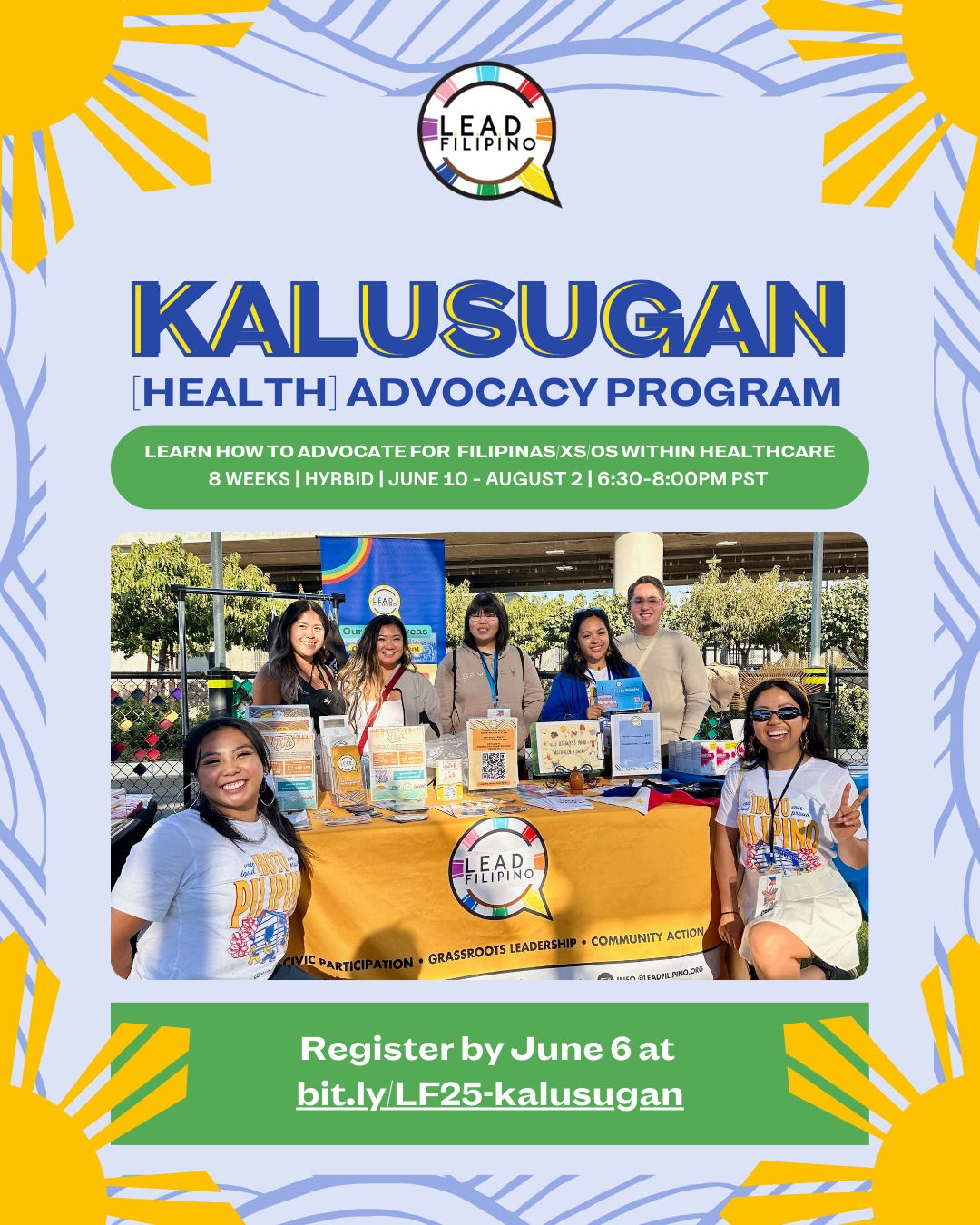 The Kalusugan [Health] Advocacy Program is an 8-week Health Equity and Organizer program engaging folks interested in Public Health and culturally-responsive care from the lens of Community Health Workers.